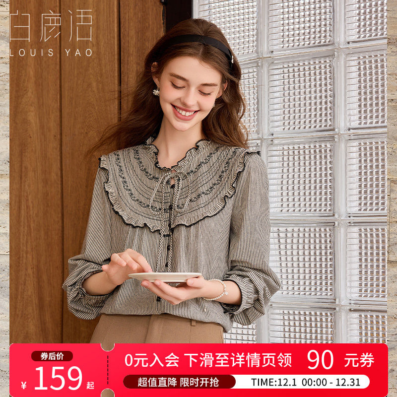 法式复古木耳边条纹衬衫25秋新款温柔设计感系带娃娃衫纯棉上衣