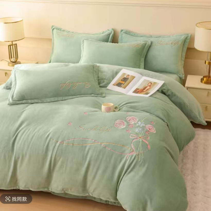 新款高克重全消光牛奶绒绣花四件套牛奶绒刺绣四件套