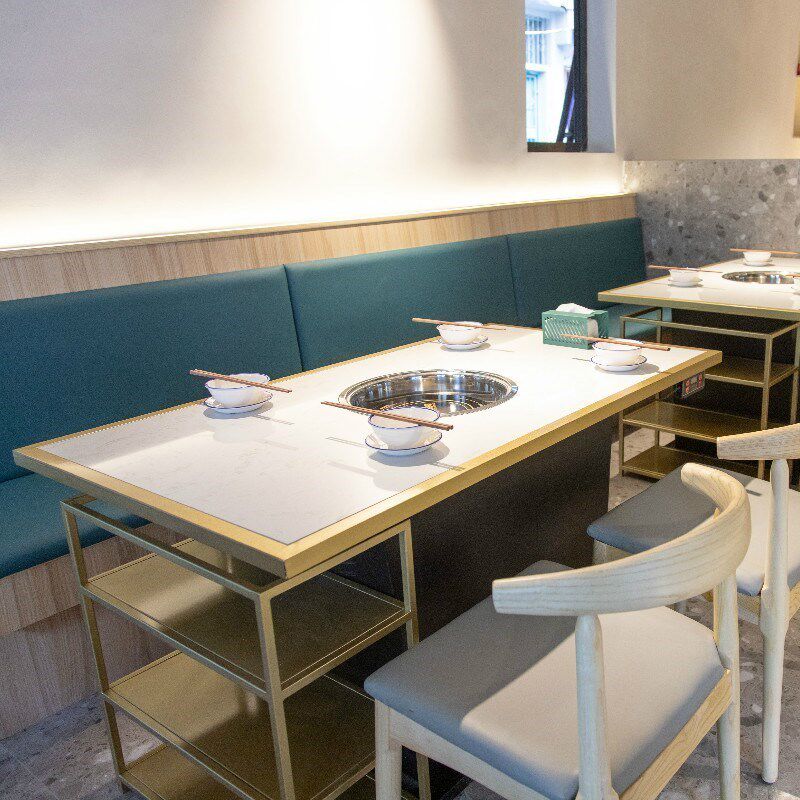 推荐理由:商用大理石内嵌火锅桌电磁炉一体烧烤肉店无烟饭店餐厅餐桌椅组合