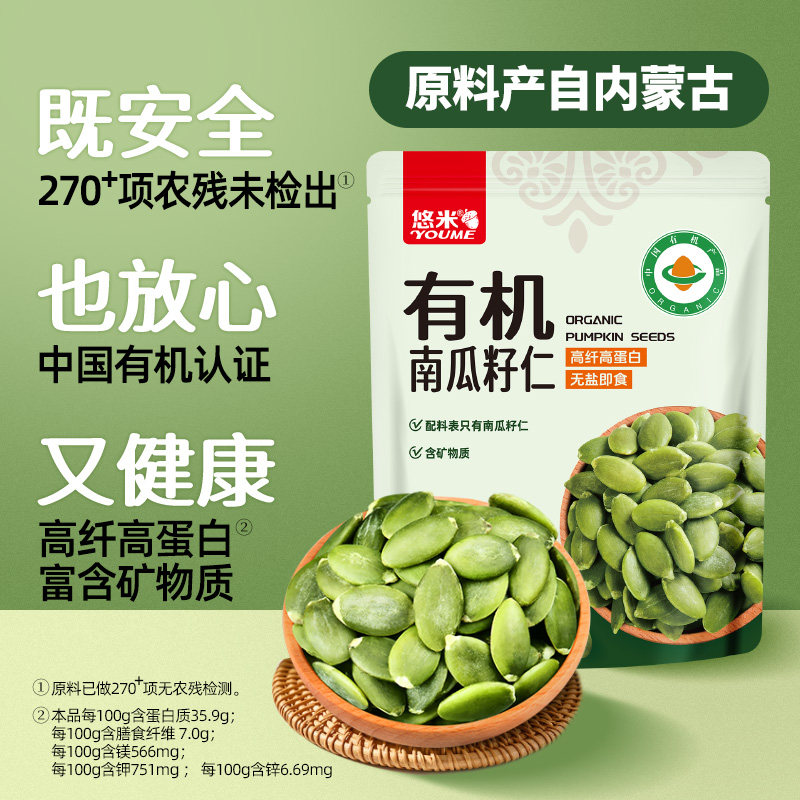 悠米有机生南瓜籽仁144g袋装无壳瓜子小包装新货办公室休闲零食