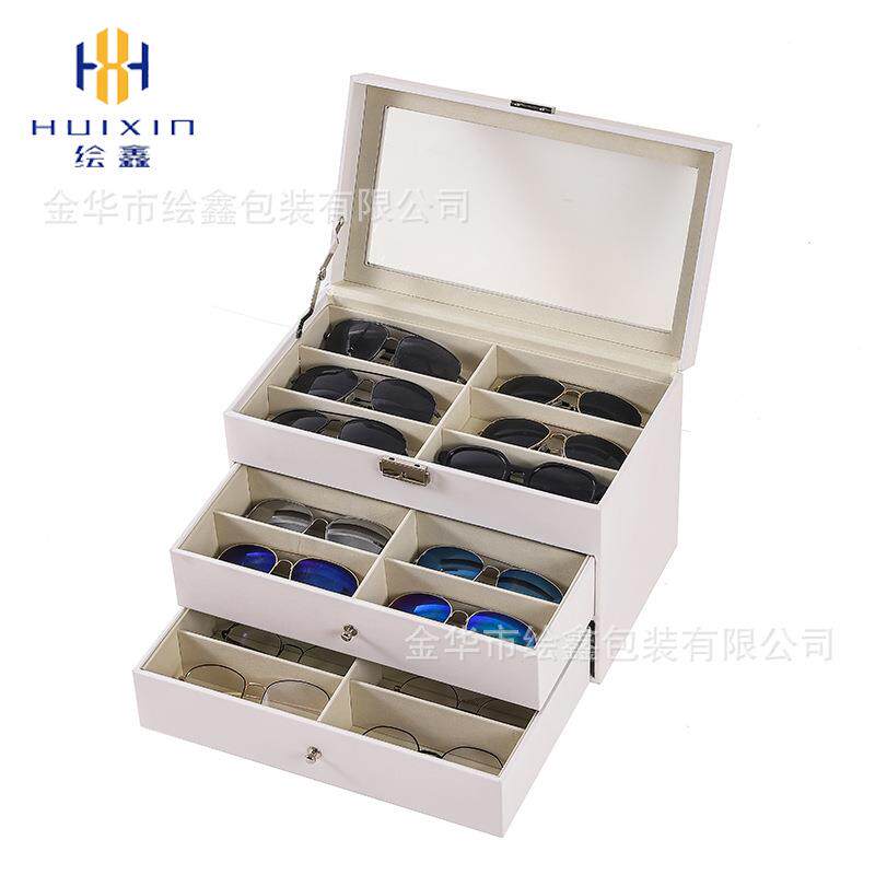 现货3层白色PU皮眼镜收纳盒 高透玻璃展示盒 打容量多功能饰品收