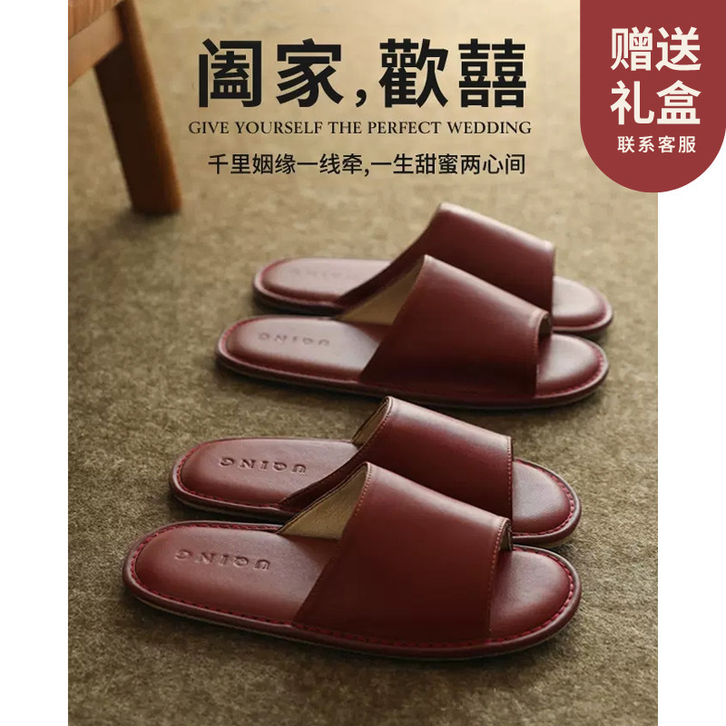 尤新高档结婚拖鞋女四季真皮喜庆红色情侣一对新婚送礼晨袍陪嫁鞋