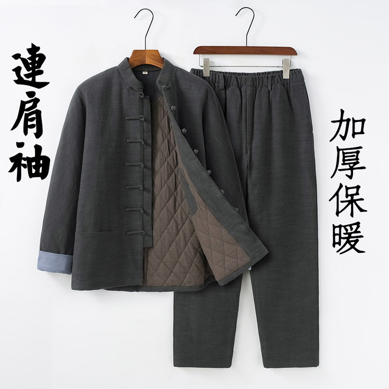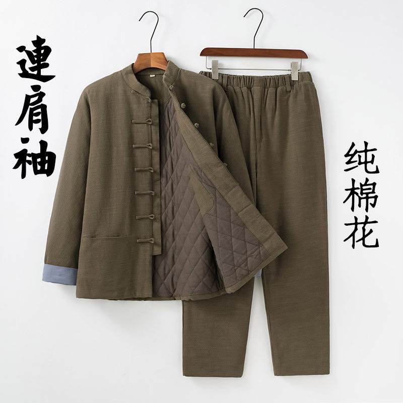 亚麻唐装男棉袄冬季棉花棉衣套装复古连肩袖汉服加厚外套休闲棉服