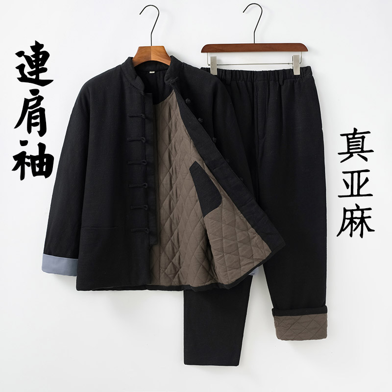 推荐理由:亚麻唐装男棉袄冬季棉花棉衣套装复古连肩袖汉服加厚外套休闲棉服