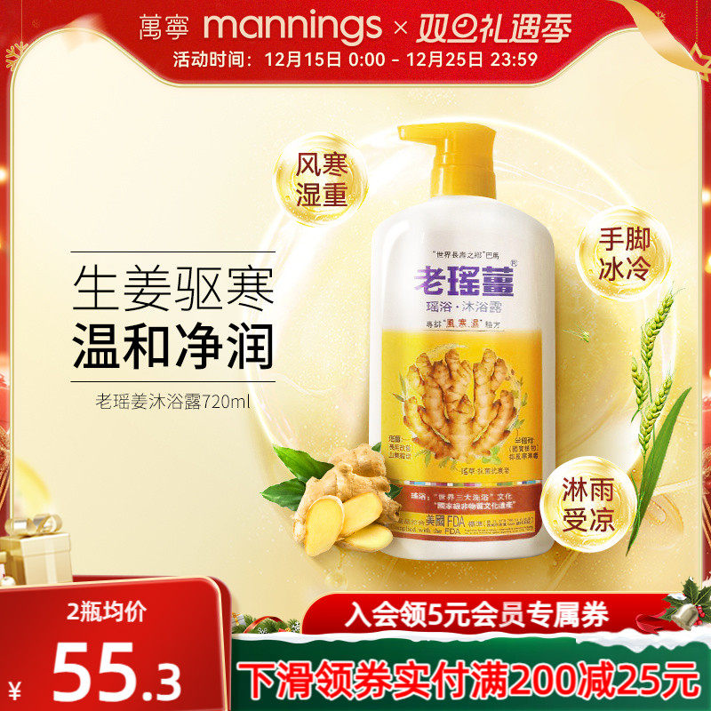 香港万宁老瑶姜沐浴露720ml生姜驱寒泡沫丰富去寒气温和清洁肌肤