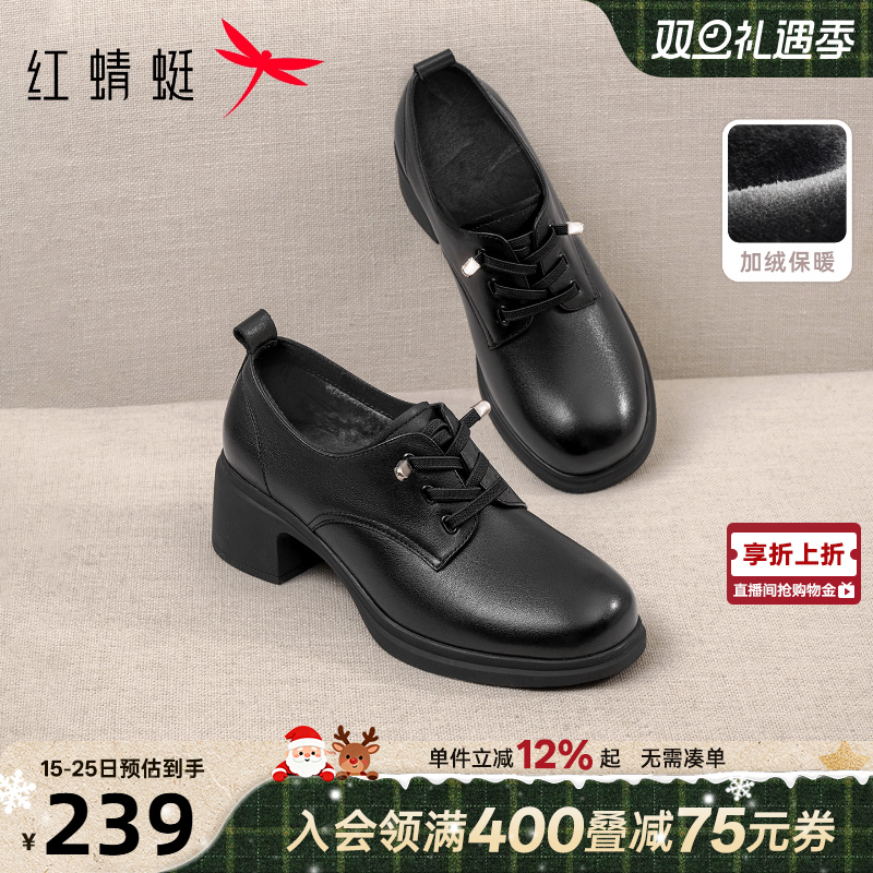 红蜻蜓加绒皮鞋女款2025新款女鞋黑色粗跟单鞋女士真皮高跟妈妈鞋