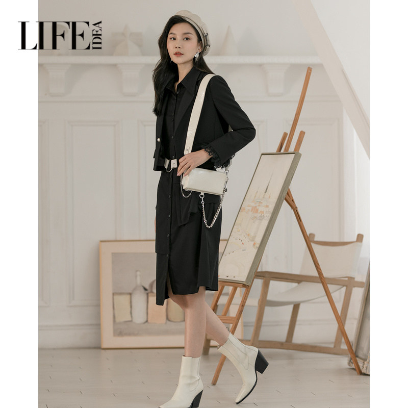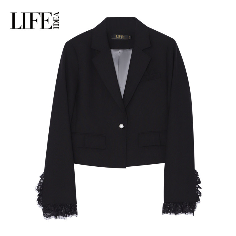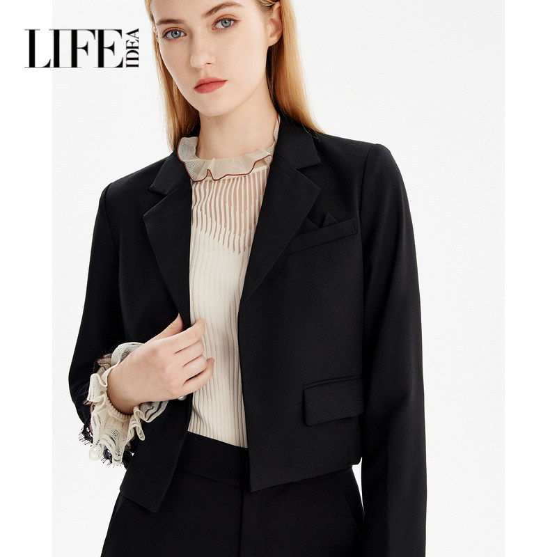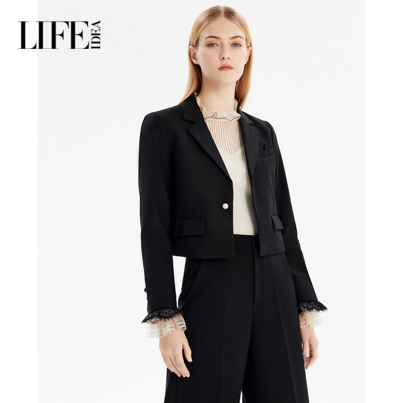 莱芙艾迪儿春季新款职场干练通勤修身显瘦微喇叭袖西装领短外套