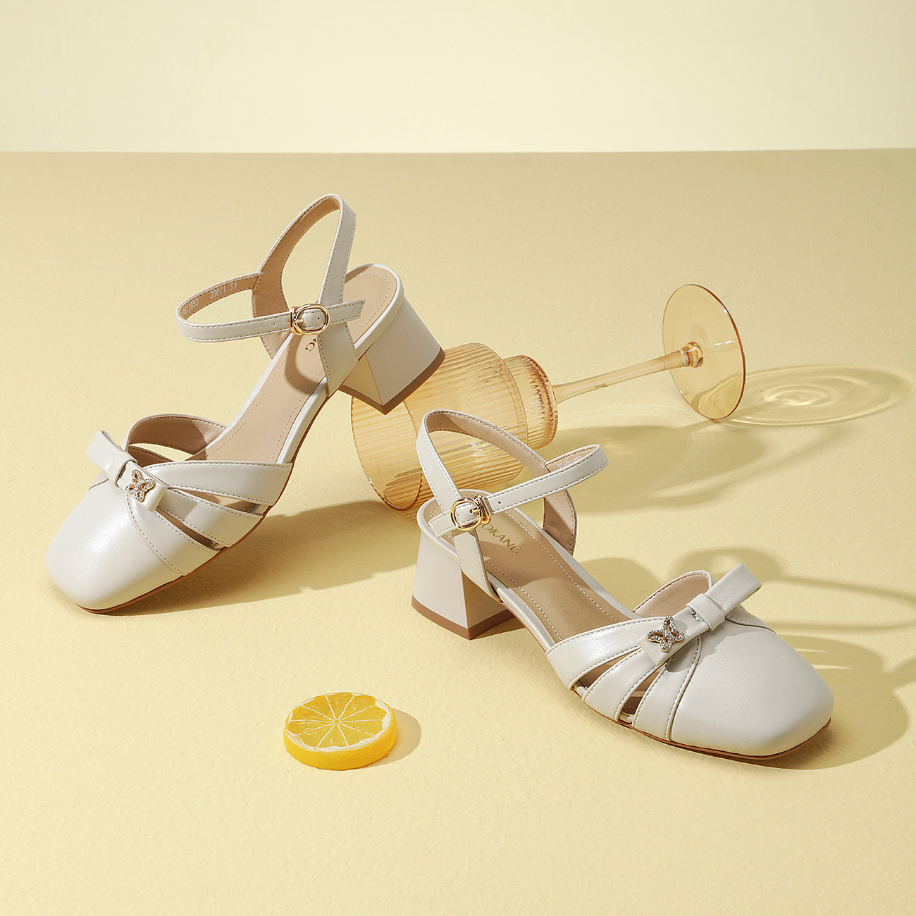 奥康女鞋 夏季新款一字带蝴蝶结中空凉鞋简约百搭粗跟凉鞋