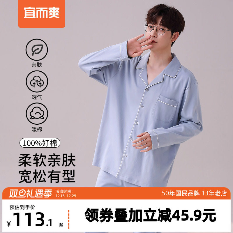推荐理由:宜而爽新款睡衣套装男亲肤轻盈透气全棉翻领长袖长裤家居服套装