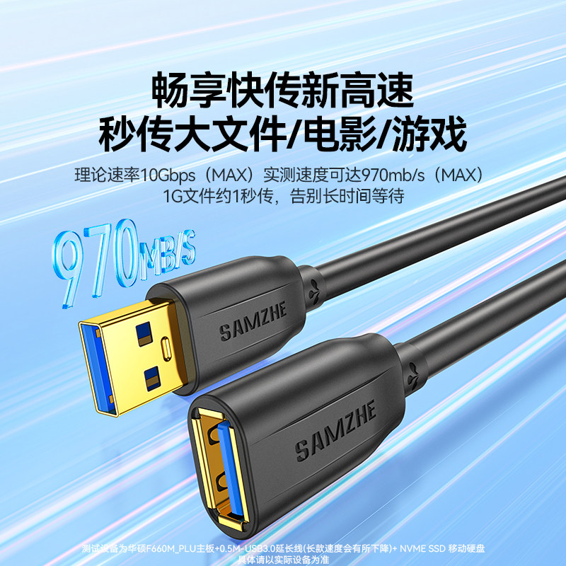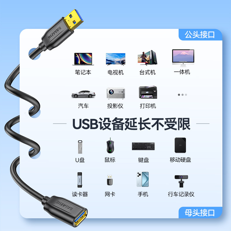 山泽usb3.0延长线1/3/5米公对母加长数据线电脑电视打印机无线网卡车载连接键盘鼠标U盘接口转接加长线