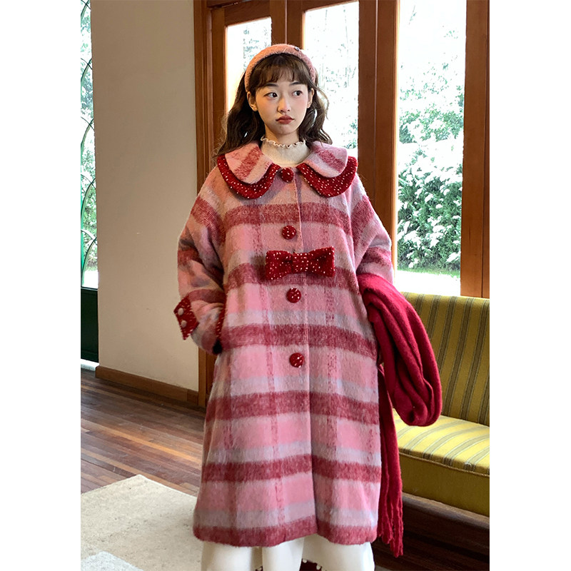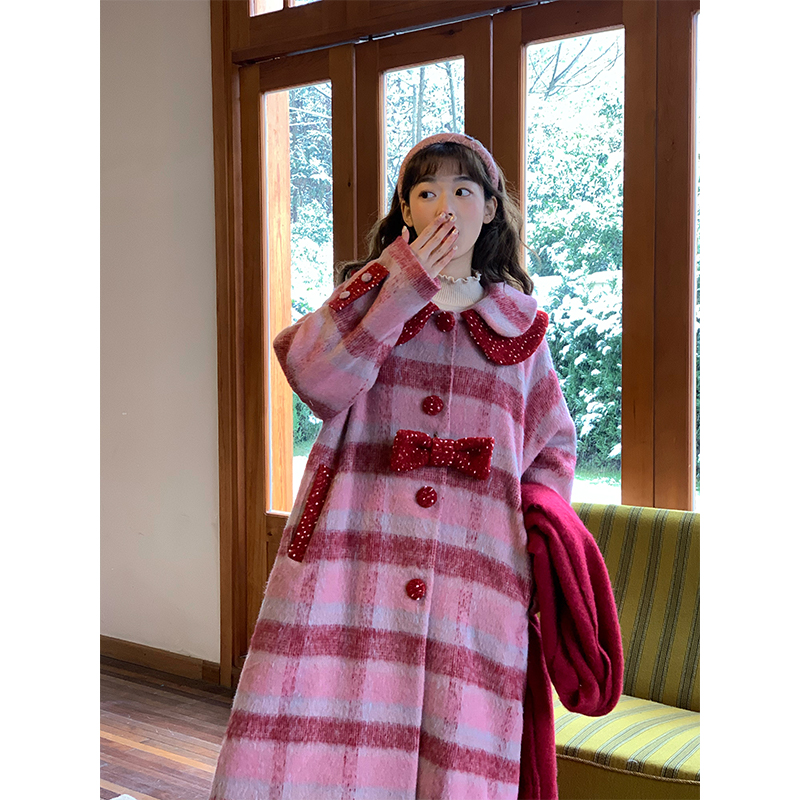 推荐理由:蛋包饭餐厅【花的圆舞曲】红色格子毛呢外套女冬季撞色过膝呢大衣
