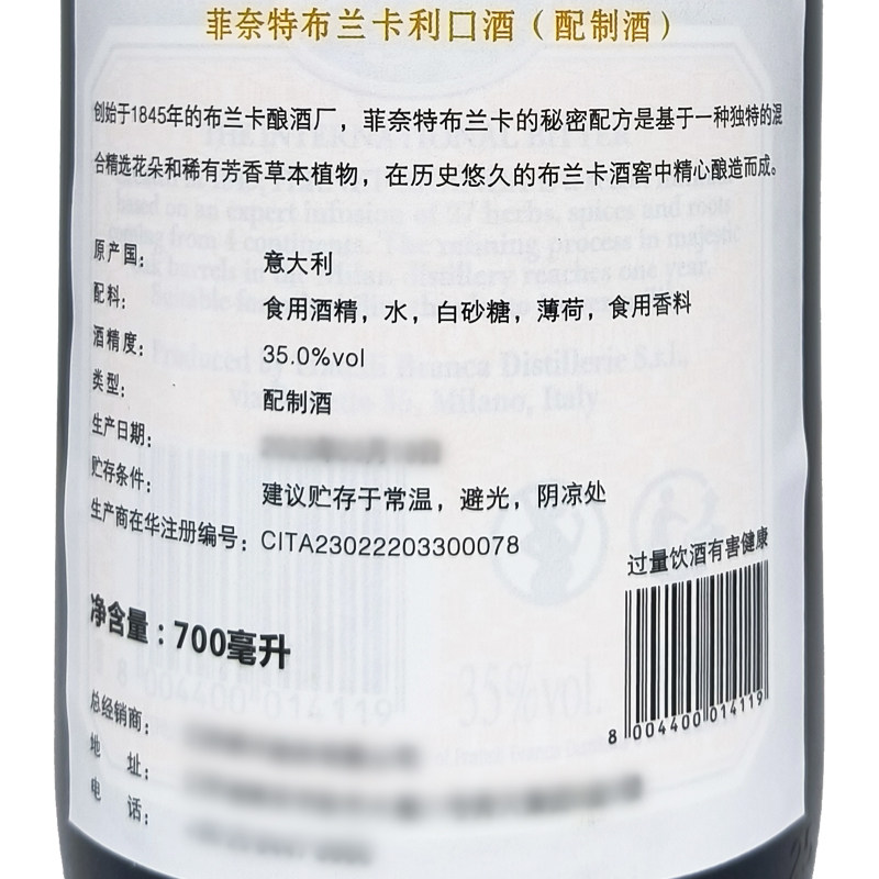 推荐理由:菲奈特布兰卡利口酒 Fernet Brance Liqueur 700ml 35度 国行正品