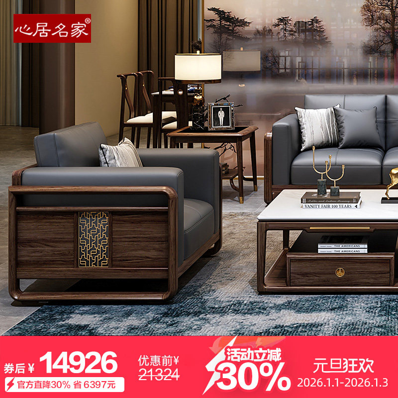 心居名家 新中式实木沙发组合乌金木客厅123人位高端轻奢头层真皮