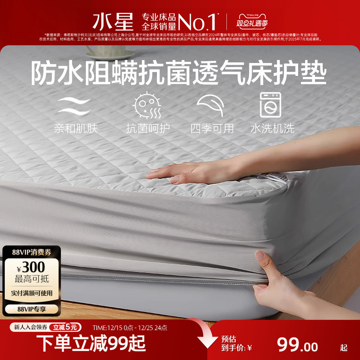 水星家纺床笠单件防水床罩席梦思床垫保护罩防尘床套罩隔尿床单罩
