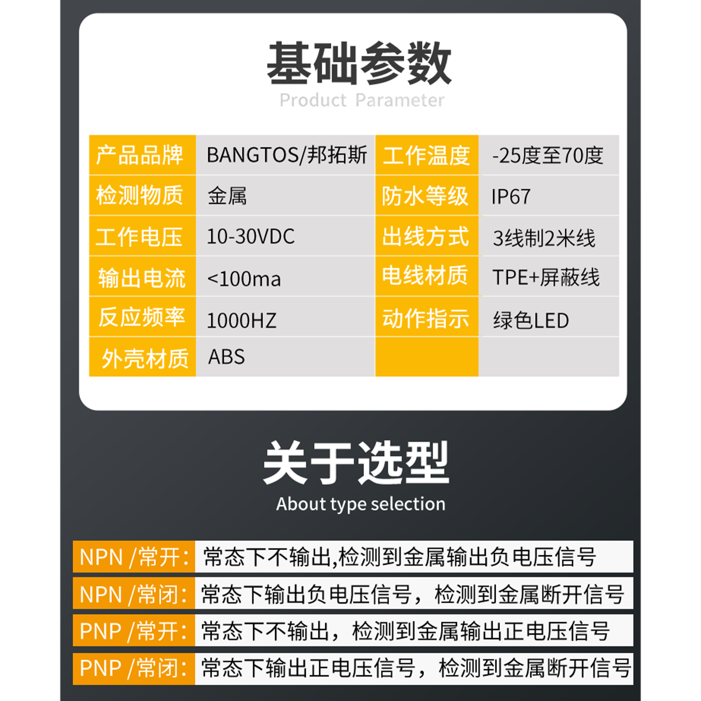 邦拓斯电感式方形24V直流接近开关三线NPN行程限位金属感应传感器