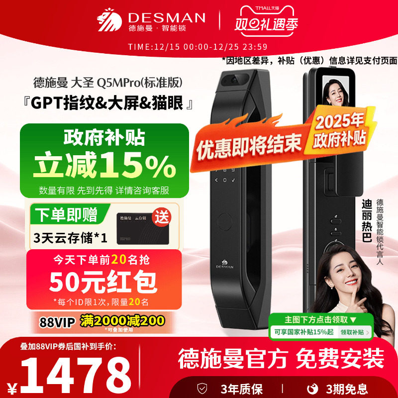 德施曼智能门锁指纹锁猫眼大屏密码锁入户门大圣Q5MPro(标准版)