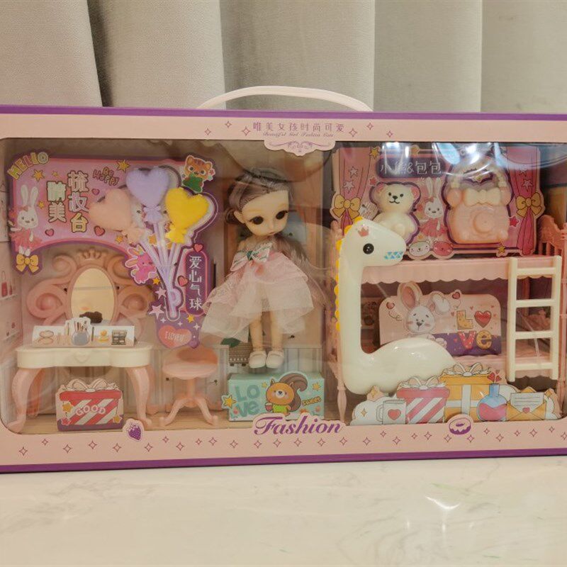 女孩公主洋娃娃扮家家酒卧室双层儿F童床精致化妆台装扮玩具套组
