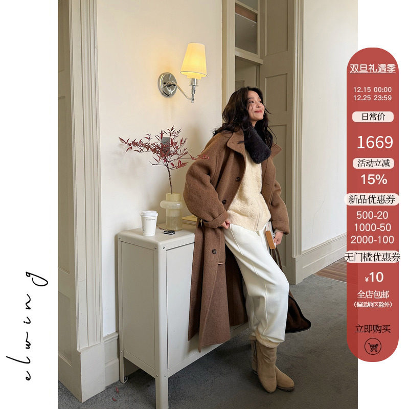 Elwing原创骆驼绒羊毛轻盈保暖立领长款大衣冬季新款双面毛呢外套