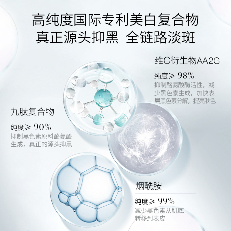 白月光精华,焕白不留斑,瓦解黑色素,点亮透光肌,淡化顽固黑色素沉淀,淡化色斑焕亮肌肤,均匀肤色,高纯度专利焕白复合成分,见证肌肤净白透亮,使用8周后停用,效果仍可保持。