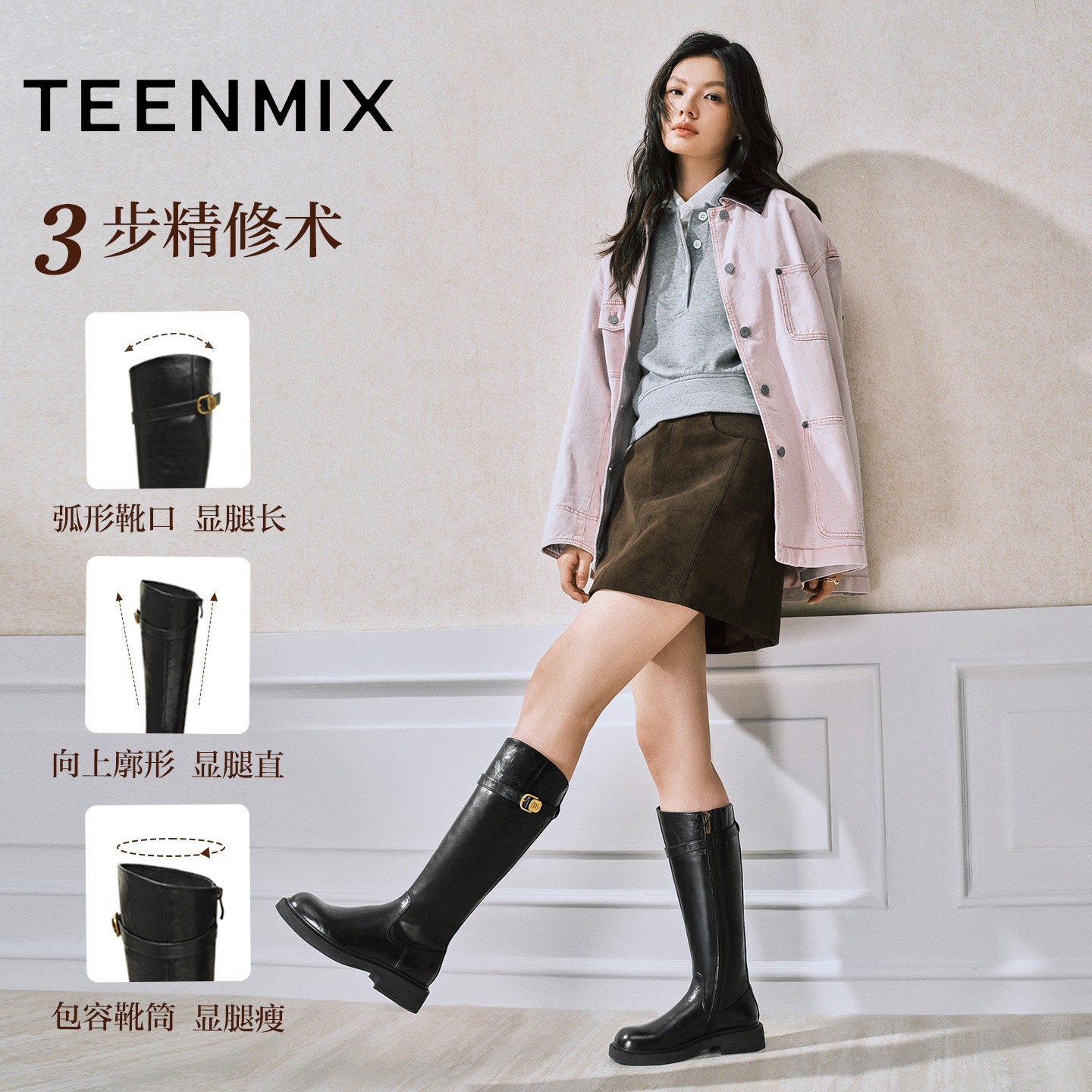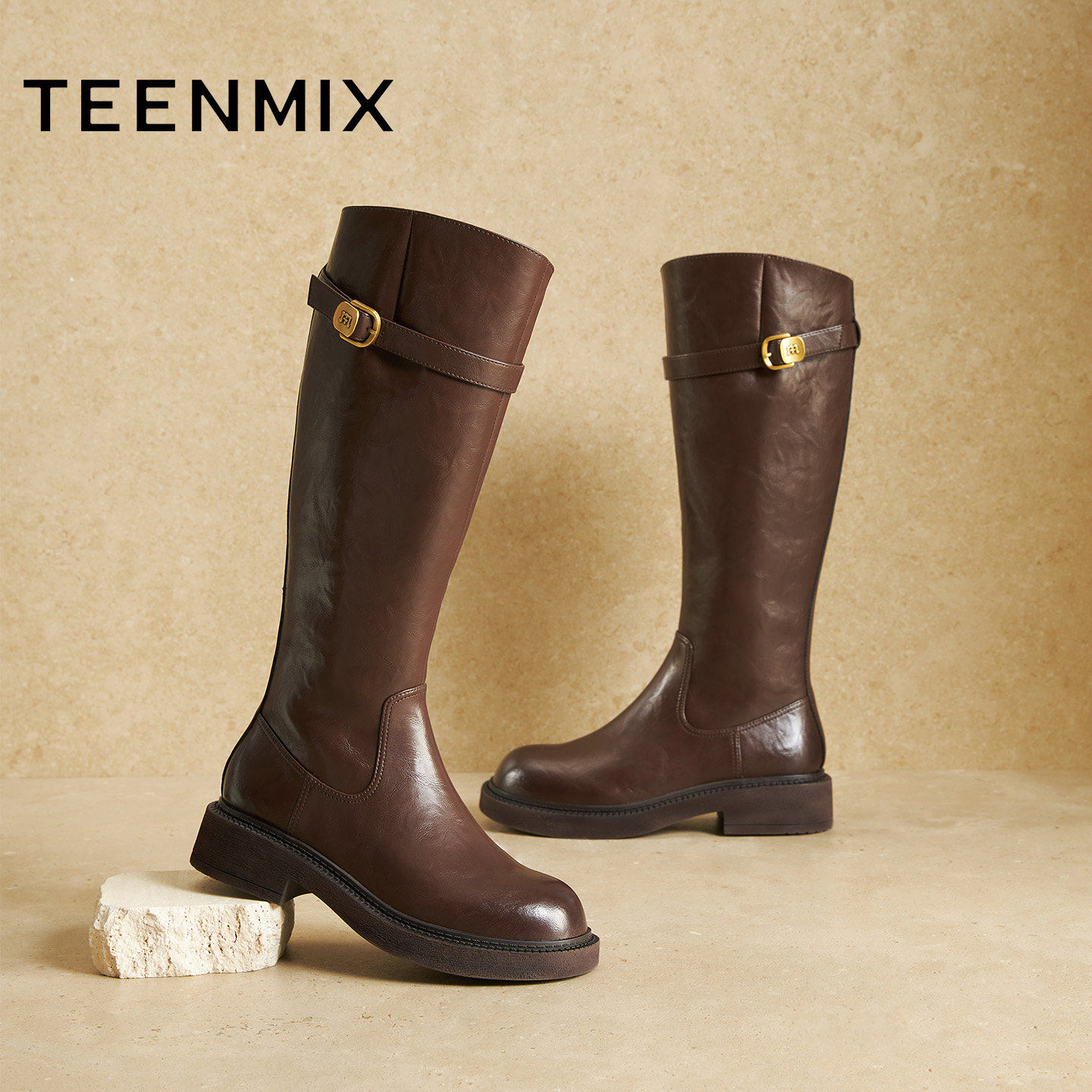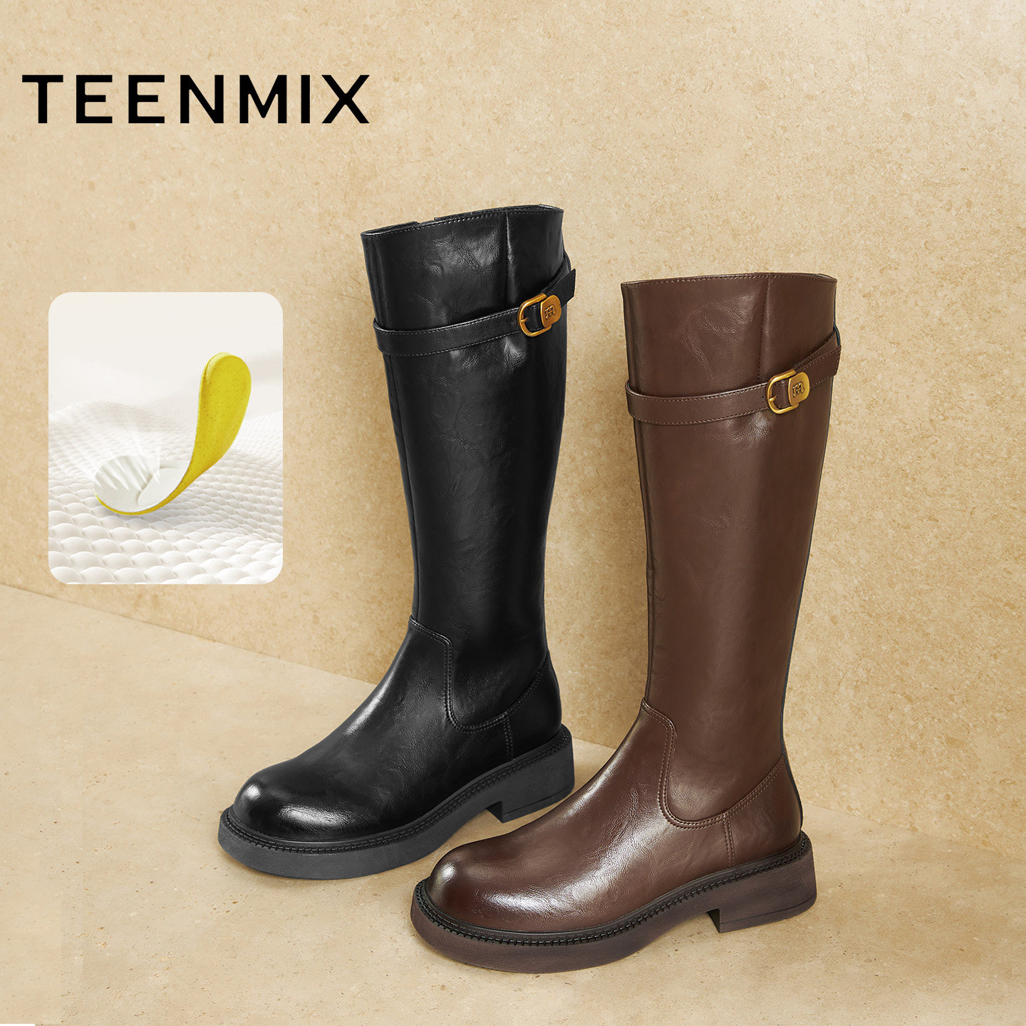 天美意复古厚底骑士靴加绒长靴女鞋子高筒时装靴皮靴2025冬季新款