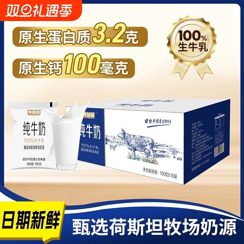 牛佳贝纯牛奶100g*16袋小白袋100%生牛乳营养早餐儿童学生早餐奶