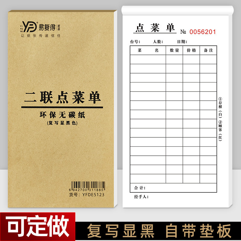 点菜单二联无碳自动复写显黑色字带垫板酒店餐厅点餐单加菜单定做