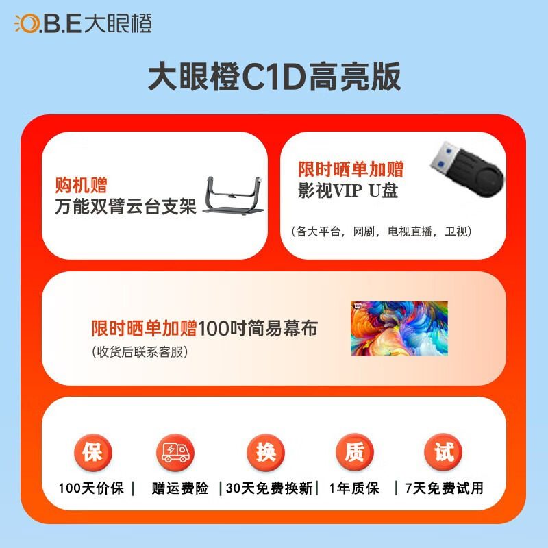【全新正品】大眼橙C1D高亮版 云台投影仪家用 真1080P便携投影机 家庭影院 国家补贴(680CVIA 全自动对焦)