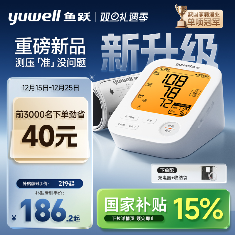 鱼跃电子血压计臂式高精准血压测量仪家用充电全自动高血压测压仪