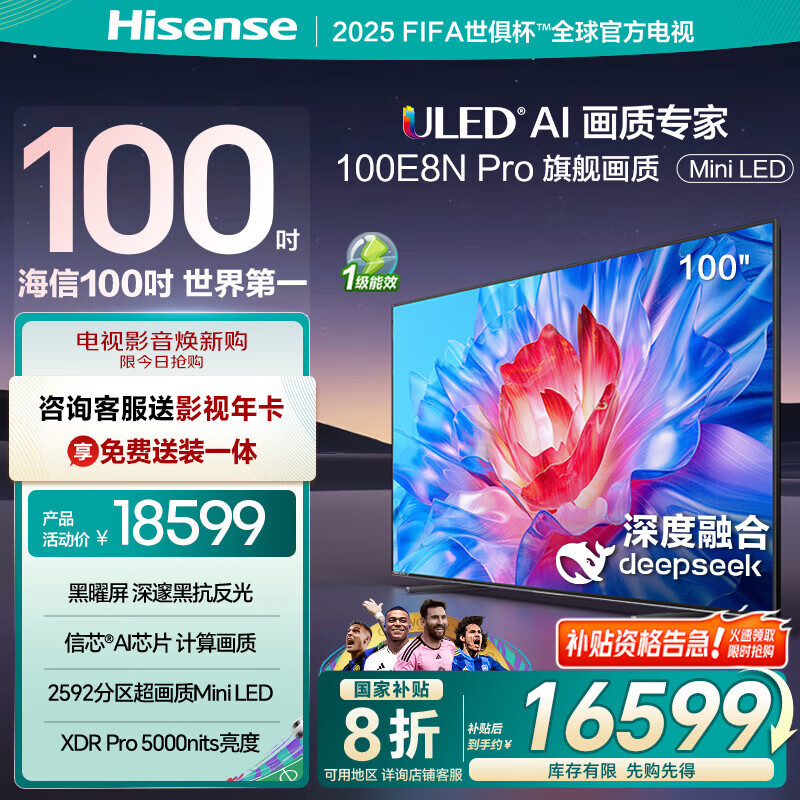 海信电视E7Q 100吋【送装一体-伸缩挂架】信芯芯片H6超频版 黑曜屏Pro XDR7000nits4224分区世界杯电视原价 ¥18299销量 1000¥ 16469.10元券